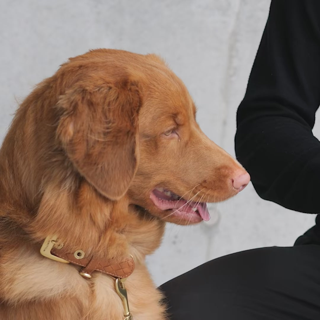 Correa para perro de napa marrón elaboradamente trenzada a mano con herrajes de latón dorado. Disponible en dos diseños y dos tamaños para perros pequeños y grandes.
