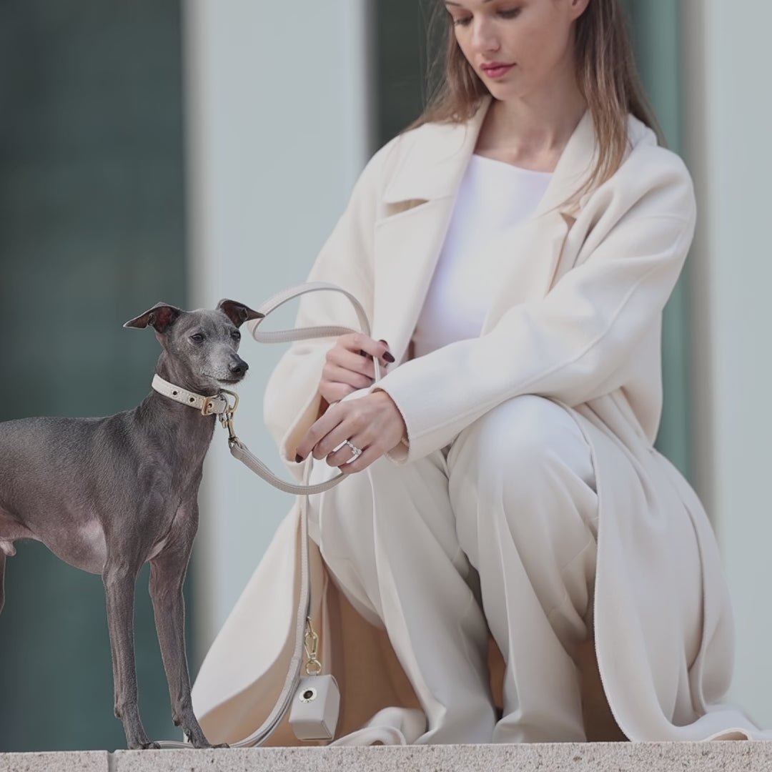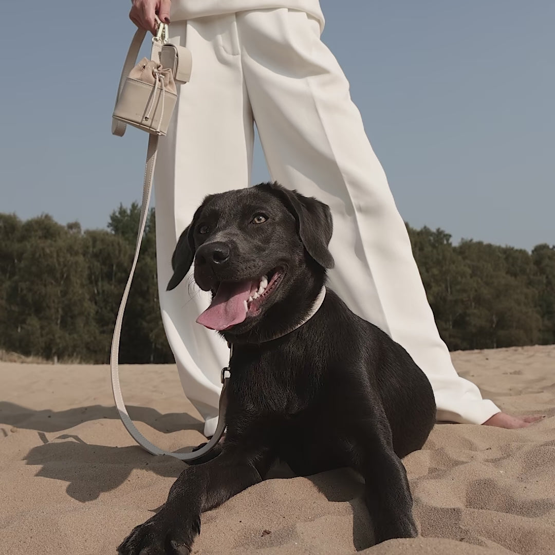 Dispensador de bolsas para la caca hecho a mano en suave y cálida piel lisa de color beige con una práctica abertura en la parte posterior para sacar las bolsas.