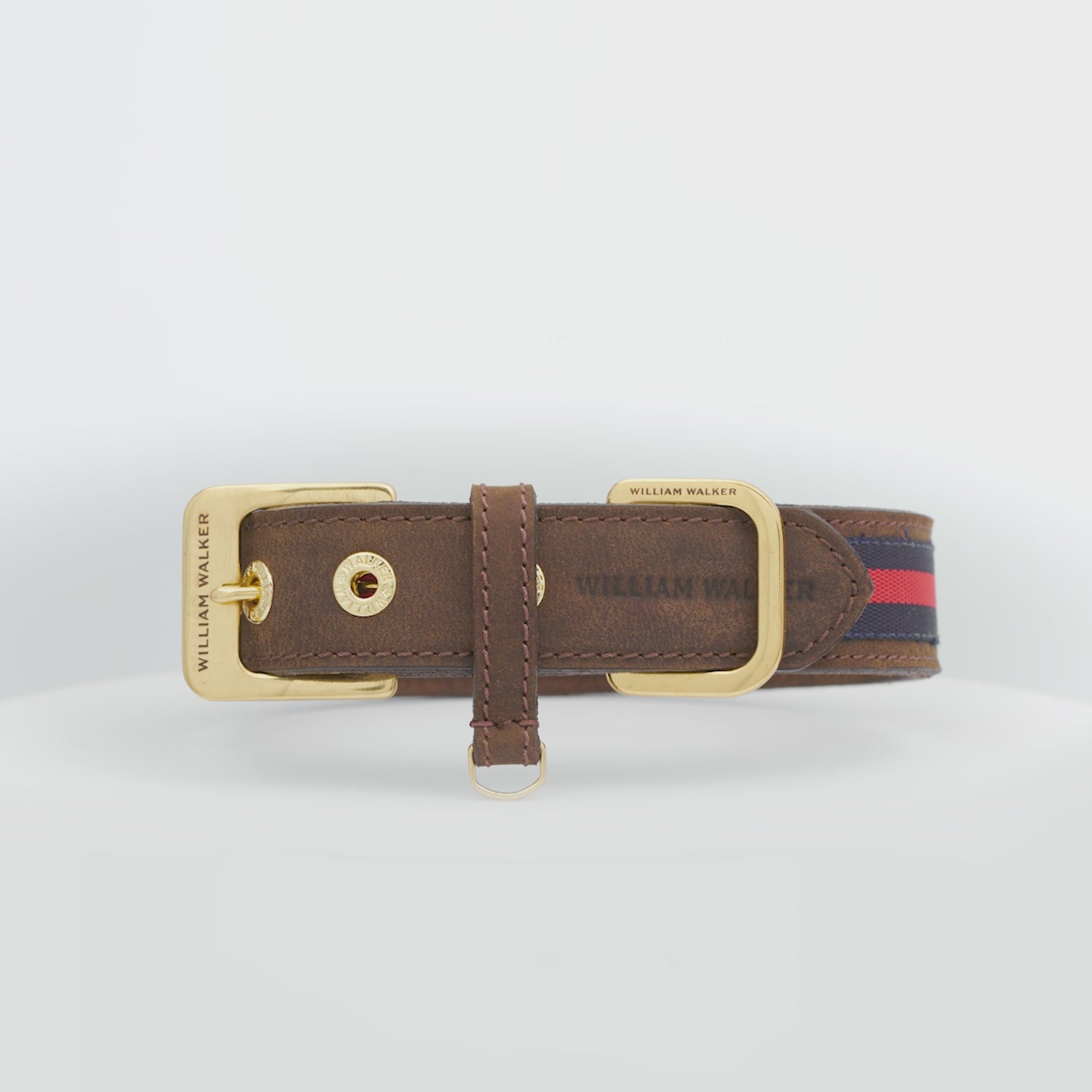 High-quality leather collar with brass fittings and red and blue decorative canvas stripes. For large and small dogs.