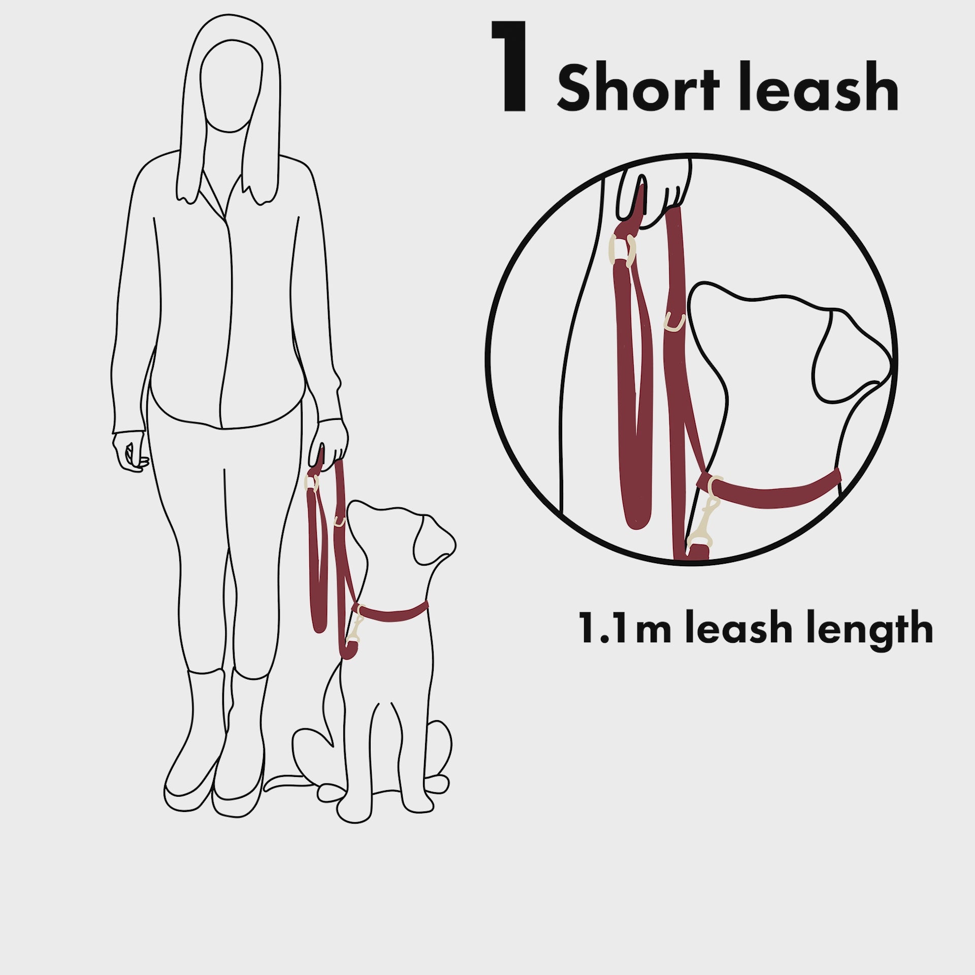 The 3-way adjustable leash has two carabiners, two D-rings and an O-ring so that the leash can be adjusted to three different lengths. It can therefore be used flexibly and is the right variant for everyday use.