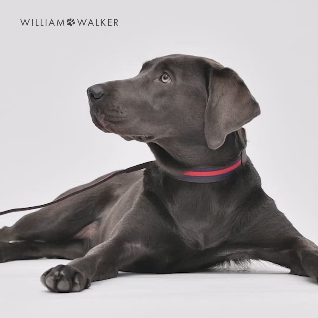 High-quality leather lead with brass fittings and decorative red and blue canvas stripes. For large and small dogs.
