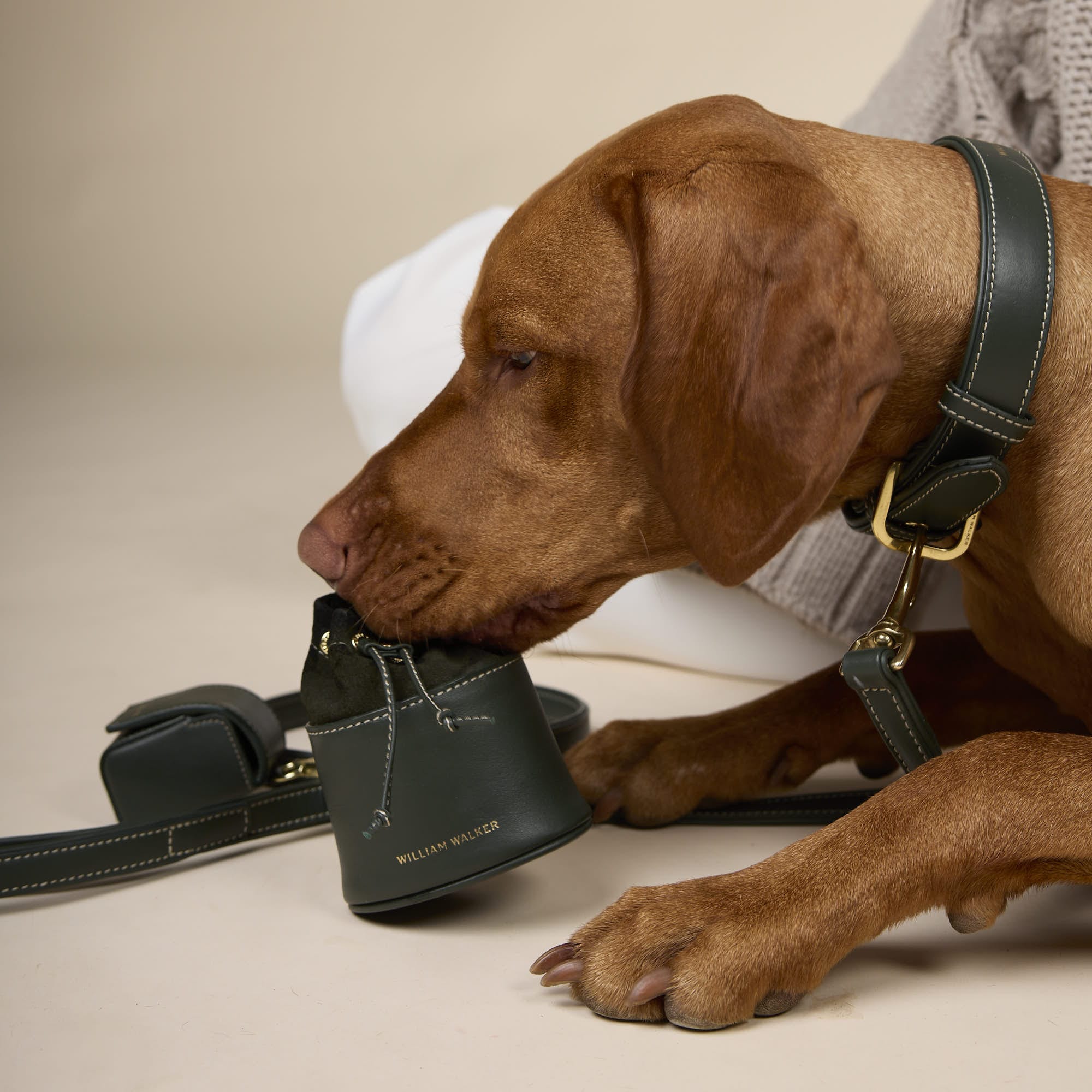Handmade treat bag made of rich, dark green suede and smooth leather with practical attachment options.